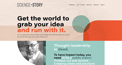 Bob Lalasz von Science+Story ist kein Coach im klassischen Sinne, er berät und ist ein Mentor für Wissenschaftler. Das Design lebt von den Farben und Formen, tollen Schwarz-Weiß-Fotos. Er ist ein Geschichtenerzähler und das sieht man der Website an, auch wenn es ein sehr sachliches Thema ist, ist das Design warm. Der erste Abschnitt führt dich zu dem Angebot, danach seine Substack Post (eine Art Blog), sein Newsletter und Case Studies über seine Arbeit mit Wissenschaftlern. So kann Design und Strategie für die Wissenschaft aussehen!